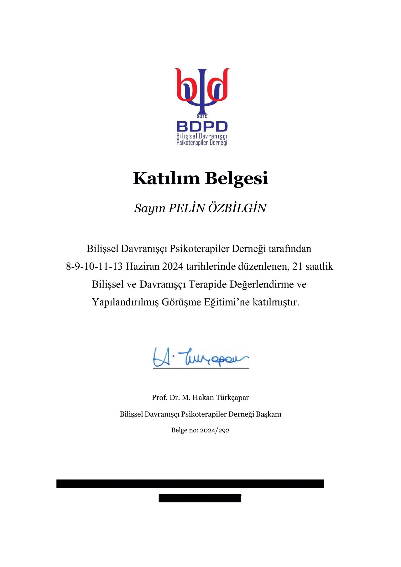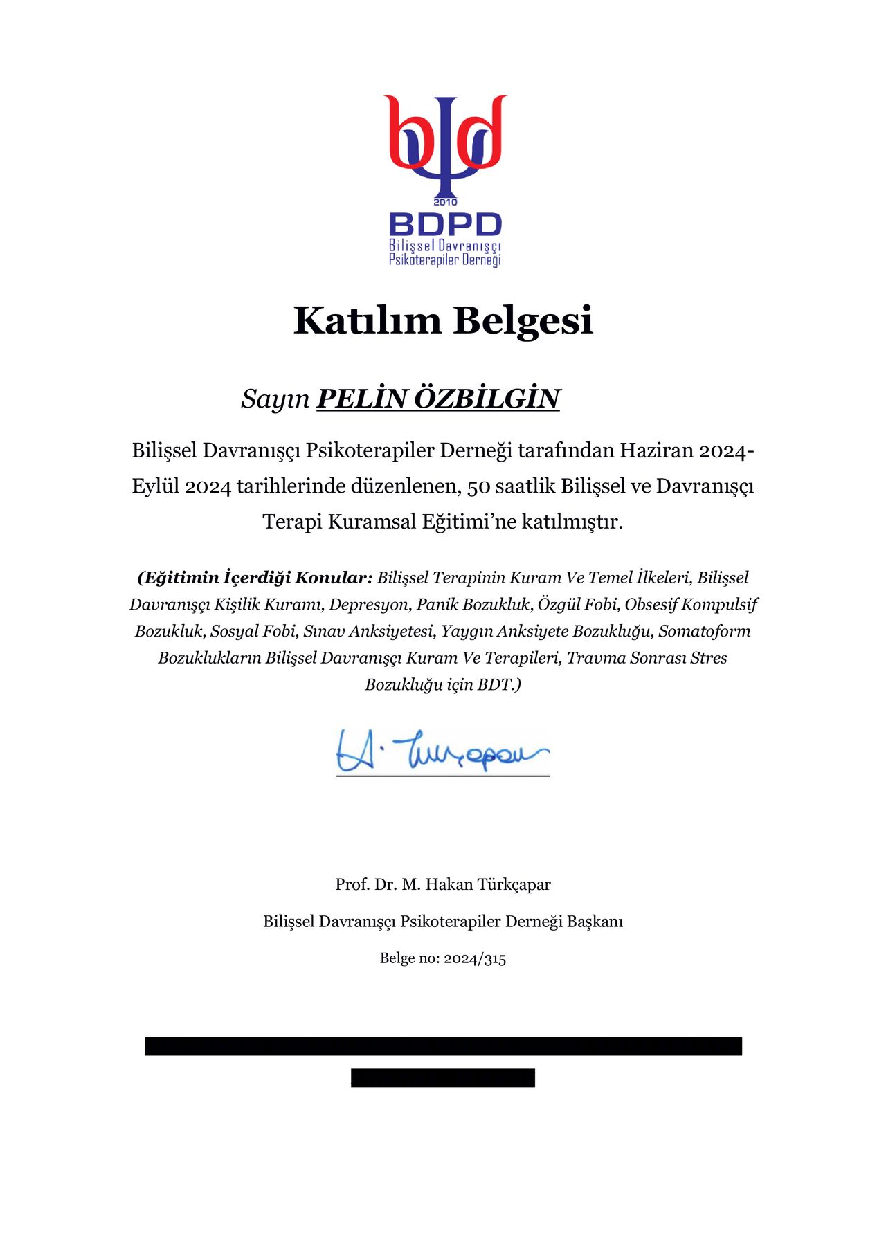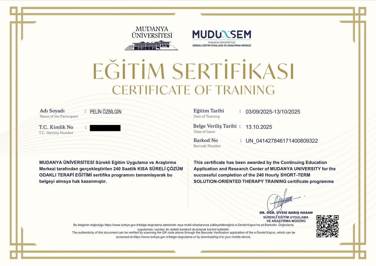 Sport Center Academy’de Basit Yoga ve Mindfulness Eğitimi aldım. Ardından uluslar arası MBSR onaylı 8 haftalık Mindfulness Odaklı Stres Azaltma Eğitimi’ni tamamladım. Bilişsel davranıçı terapi, kısa süreli çözüm odaklı terapi ve mindfulness tekniklerini baz alarak danışanlarımın sağlığı ön planda olacak şekilde çalışmalarıma devam ediyorum. Terapilerimde ekole uygun olarak ödevlendirme, test yapma ve sıkı takibi öncelik haline getiriyorum. Aile Danışmanlığı eğitimim devam etmektedir. Bütün eğitimlerim sertifikalı ve e-devlet onaylıdır. İngilizce lisans eğitimim ve klinik derslerimdeki pratiğim dolayısıyla istenildiği takdirde İngilizce terapi de vermekteyim.