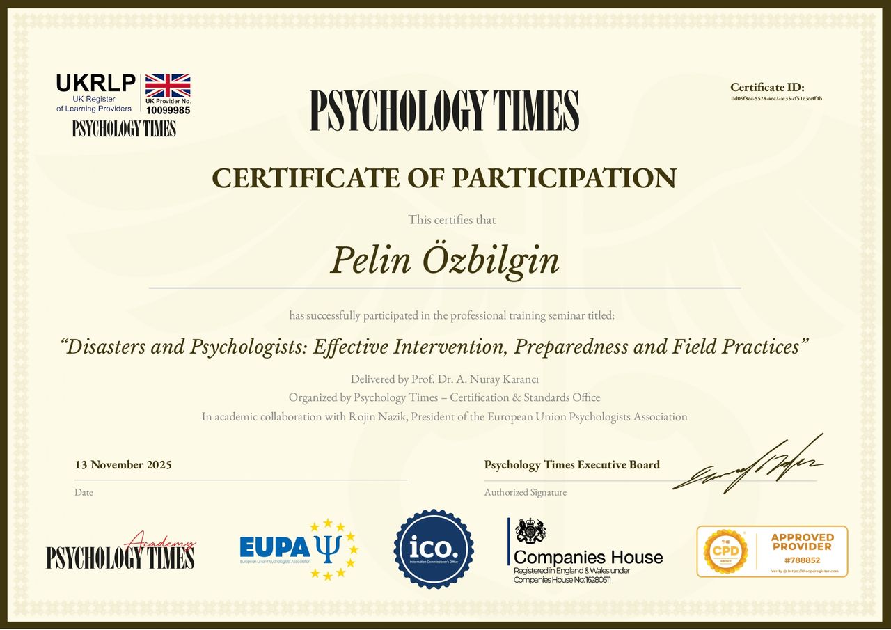 2023 yılında yaşanan Kahramanmaraş merkezli depremlerden etkilenen depremzedelere travma odaklı psikososyal ilkyardım desteği verdim. Mezuniyetimin ardından, ebebek bünyesinde “Bebekolog Eğitimi” aldım ve “Uyku Elçisi” olarak ebeveynlere bebeklerinin uyku rutinleriyle ilgili danışmanlık verdim. 2024 yılında Hakan Türkçapar ve ekibi tarafından verilen Bilişsel Davranışçı Psikoterapiler Derneği onaylı Bilişsel Davranışçı Terapide Değerlendirme ve Yapılandırılmış Görüşme, Kurumsal Bilişsel Davranışçı Terapi eğitimlerimi tamamladım. Ardından Mudanya Üniversitesi'nin verdiği onaylı Kısa Süreli Çözüm Odaklı Terapi eğitimimi tamamladım. Psychology Times kapsamında gerçekleştirilen Afet ve Psikologlar seminerine katıldım.